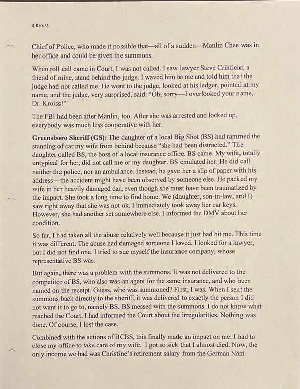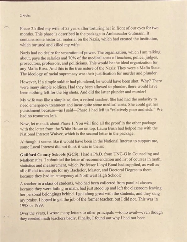 Our family has two citizenships: GERMAN (born) and AMERICAN (naturalized). We could immigrate on the basis of a so-called NATIONAL INTEREST WAIVER, which waived sponsorship by American citizens or entities. I founded the above institute and was its CEO for 20 years. The events described in Document 2 damaged our health and finances so much, that the impact of the German crimes could not be buffered. My wife died from them, I almost did. My daughter Doris, who had to watch all this for about two years, is shell-shocked. She is slowly getting better because I have progressed in health. I only have left: Diabetes, pain, mobility and hearing problems. These issues combined with my age might make it necessary that Doris be of help with this petition.